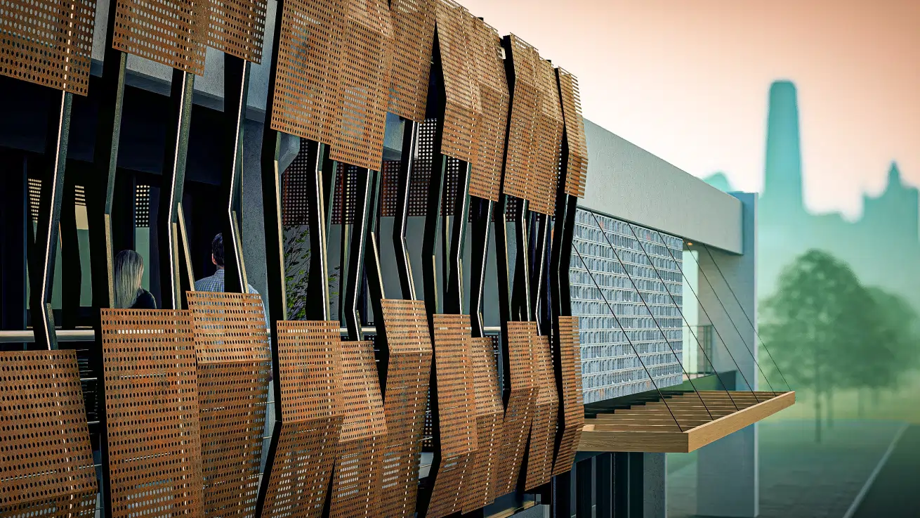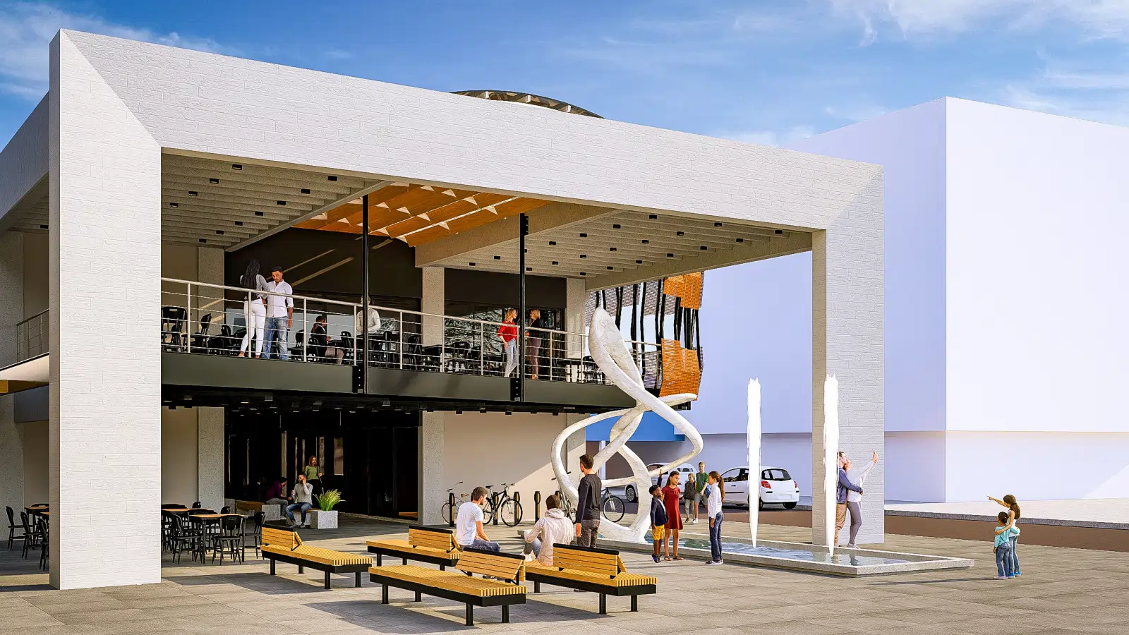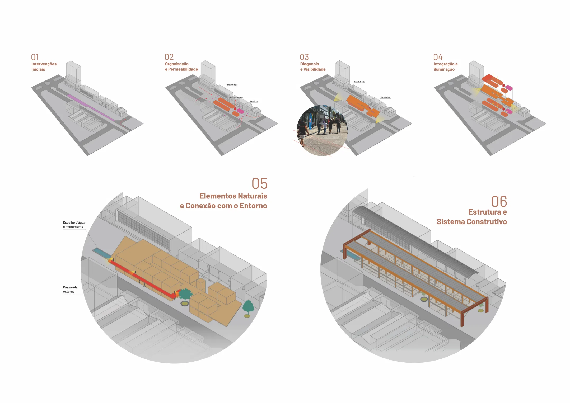 Composta por uma estrutura de concreto pré-moldado e cobertura metálica curva com fechamento translúcido, a edificação garante permeabilidade visual e física no pavimento térreo, favorecendo a apropriação do espaço pelos pedestres. Diagonais inspiradas na paginação original do calçamento guiam o partido formal e criam recortes estratégicos, permitindo visuais amplos da praça e da cidade. Elementos como espelho d’água, árvores integradas, pergolados com textura amadeirada e materiais como aço corten e cobogós dialogam com a paisagem litorânea, gerando um ambiente acolhedor e contemporâneo.