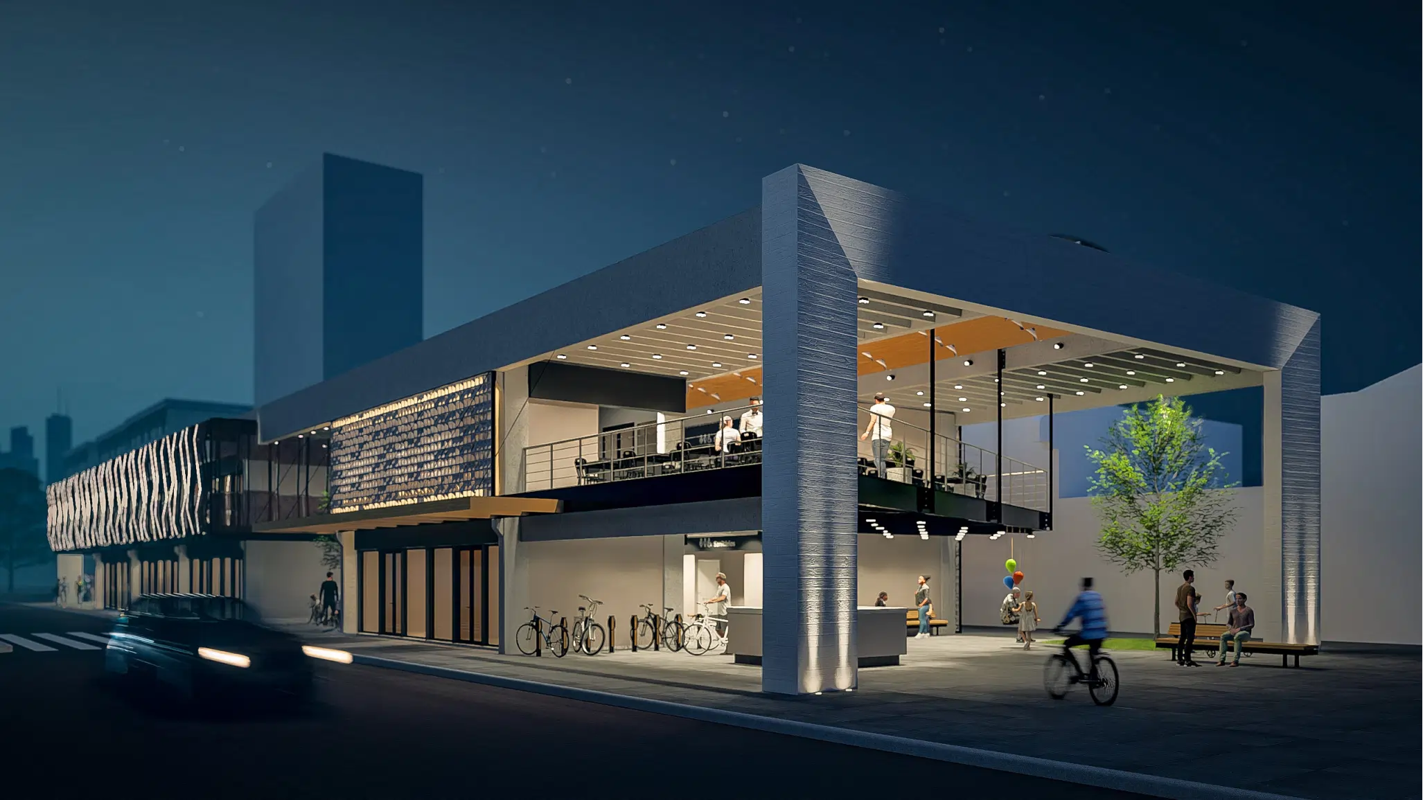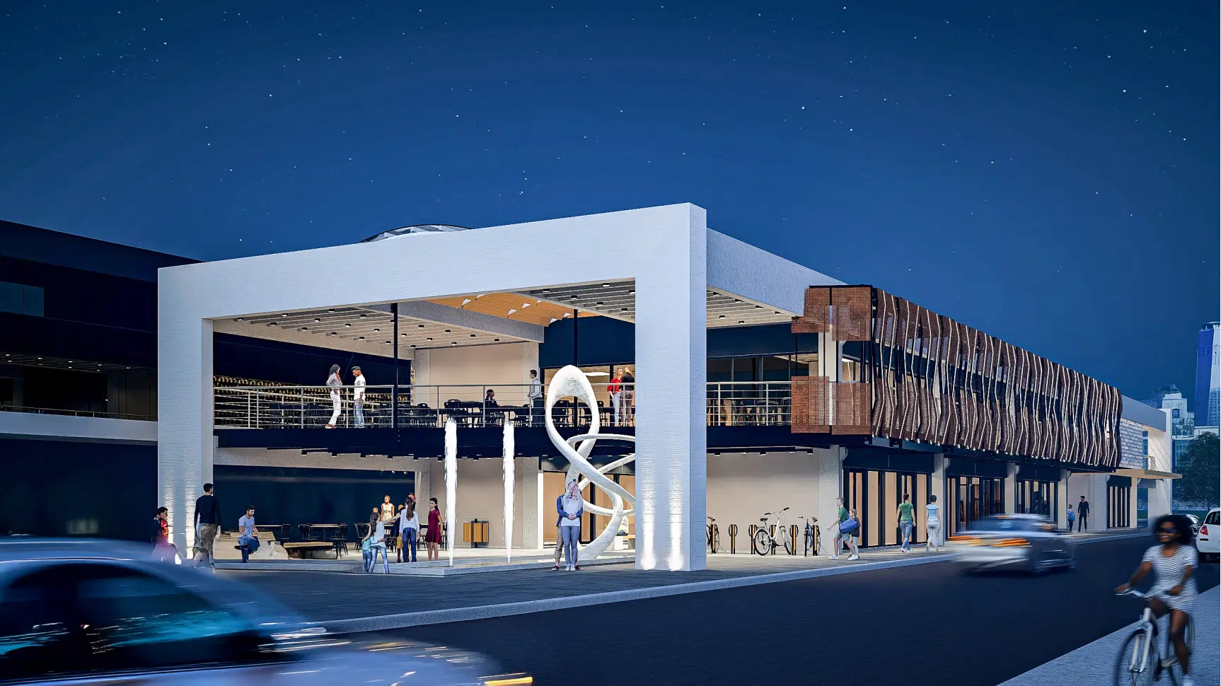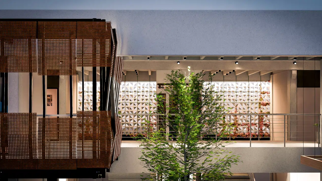 Composta por uma estrutura de concreto pré-moldado e cobertura metálica curva com fechamento translúcido, a edificação garante permeabilidade visual e física no pavimento térreo, favorecendo a apropriação do espaço pelos pedestres. Diagonais inspiradas na paginação original do calçamento guiam o partido formal e criam recortes estratégicos, permitindo visuais amplos da praça e da cidade. Elementos como espelho d’água, árvores integradas, pergolados com textura amadeirada e materiais como aço corten e cobogós dialogam com a paisagem litorânea, gerando um ambiente acolhedor e contemporâneo.